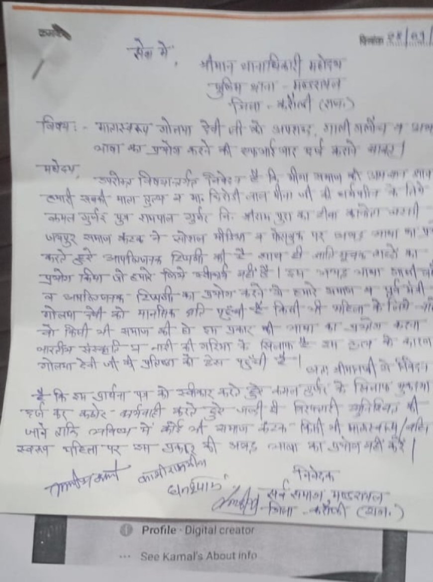 इस दौरान मनोज जादौन (पंचायत समिति सदस्य मण्डरायल ) ने कहा कि पूर्व मंत्री के खिलाफ की गई टिप्पणी निंदनीय हैं और इस प्रकार की टिप्पणियों से समाजिक सौहार्द्र बिगड़ता है । ऐसे समाज कंटकों के खिलाफ कारवाई की मांग की।