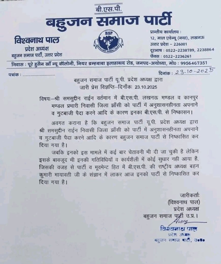 बहुजन समाज पार्टी के प्रदेश अध्यक्ष विश्वनाथ पाल ने लखनऊ और कानपुर मंडल के कोऑर्डिनेटर शमसुद्दीन राईन को अनुशासनहीनता और गुटबाजी के आरोप में पार्टी से निष्कासित किया।