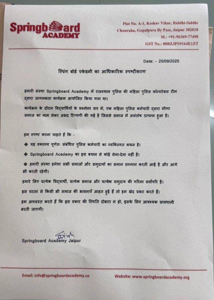 जयपुर के स्प्रिंग बोर्ड एकेडमी में मीणा समाज पर महिला कांस्टेबल की विवादास्पद टिप्पणी के बाद विरोध प्रदर्शन, पुलिस कमिश्नर ने कांस्टेबल को निलंबित किया।
