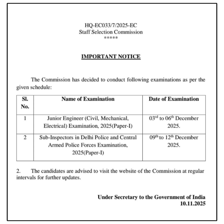 एसएससी जूनियर इंजीनियर (SSC JE 2025 Paper 1) की परीक्षा 3 दिसंबर से 6 दिसंबर 2025 तक आयोजित की जाएगी।