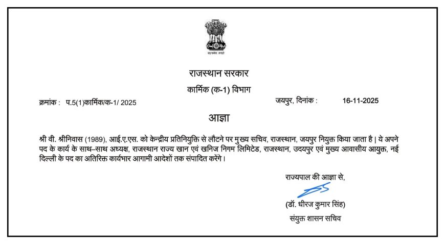Rajasthan News: वी. श्रीनिवास राजस्थान के नए मुख्य सचिव बने। केंद्र से रिलीव होकर वे 17 नवंबर को चार्ज लेंगे। प्रशासन में बड़े फेरबदल की संभावना।